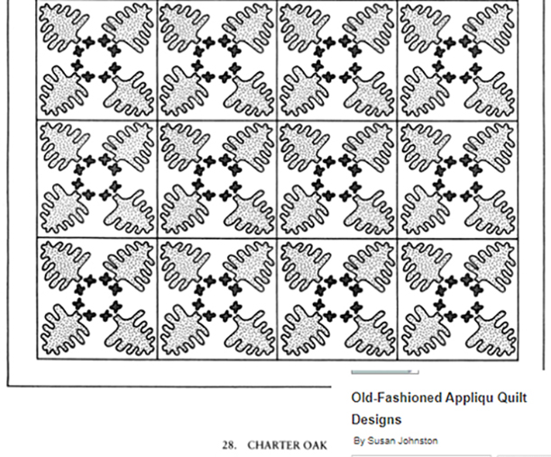 The Charter Oak design was given further fame in the new wave of writing about quilts in the last quarter of the last century with Ione Benck McIntyre’s 1981 pattern book and “history” The Charter Oak.